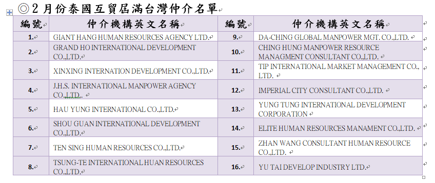 16家台灣仲介 泰國互貿2月屆滿 初次申請審查進度 可向就業廳查詢